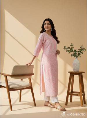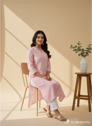 Our beautiful Baby Pink - Bahaar Cotton Terry Voile Chikankari Kurta With Mukaish Work, has been hand embroidered with twisted cotton thread with sparkling mukaish work.