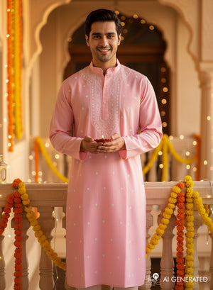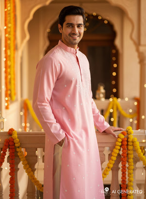 Baby Pink - Nawab Cotton Chikankari Men Long Kurta