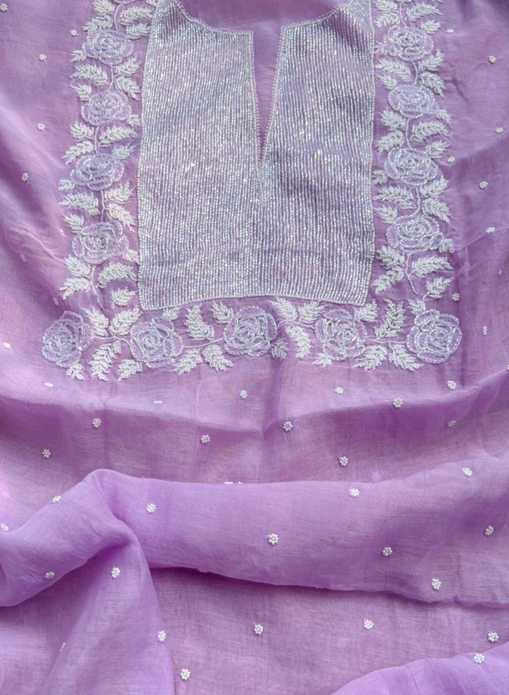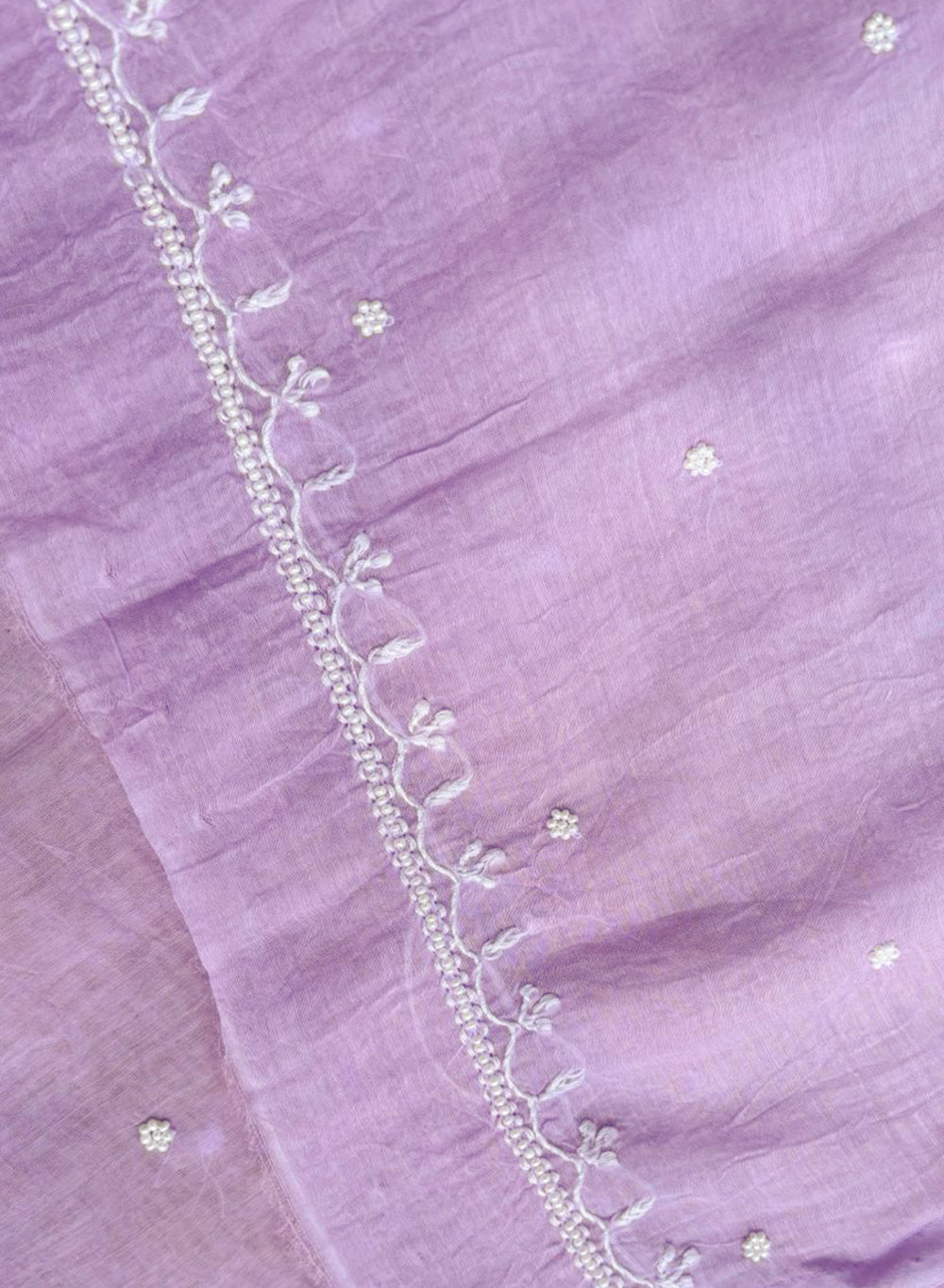 Our Lilac - Nayaab Mul Chanderi Chikankari Dress Material With Moti & Katdana Work, has been hand embroidered with twisted white cotton thread,