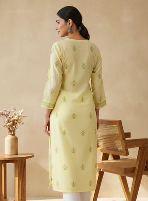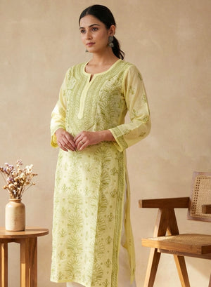 Lime Yellow With Green Thread - Cotton Terry Voile Bahaar Chikankari Kurta