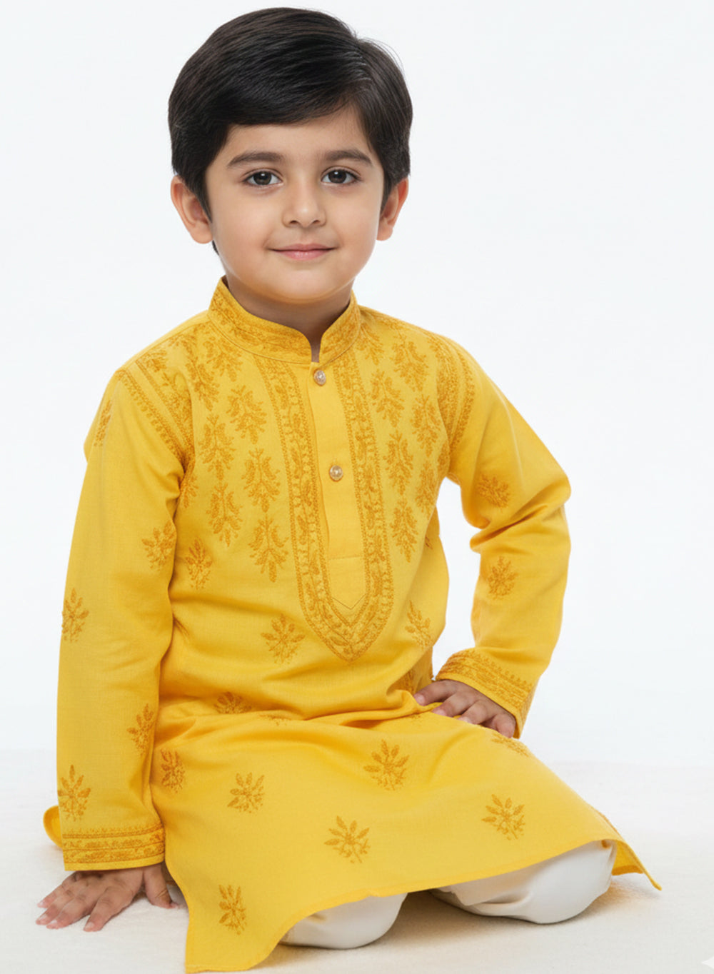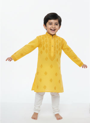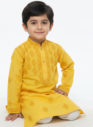 Our Eklavya White - Cotton Chikankari Kidswear Kurta with hand embroidered chikankari in a traditional neck booti ,for Chhote Nawabs, are woven from finely milled cotton terry voile, cool and crisp against their soft skin.