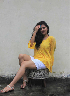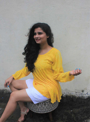 Our one of a kind Pure Cotton Short Top, has been hand embroidered with resham dhaaga and has beautiful chikankari motifs.