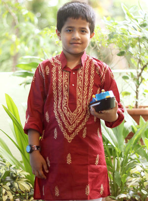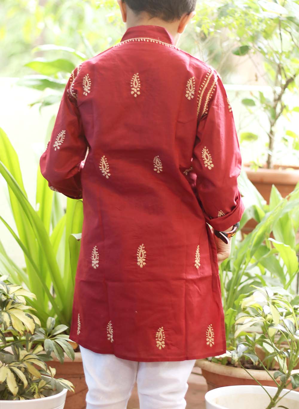 Our Navy Blue Cotton Kurta with hand embroidered chikankari in a traditional neck booti ,for Chhote Nawabs, are woven from finely milled cotton terry voile, cool and crisp against their soft skin.