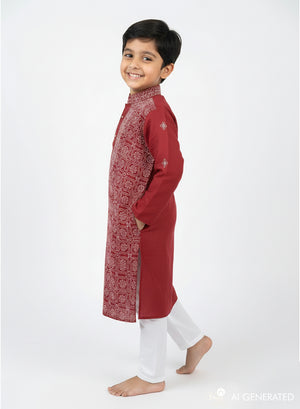 Our Maroon Front Jaal Cotton Kurta with hand embroidered chikankari in a traditional neck booti ,for Chhote Nawabs, are woven from finely milled cotton terry voile, cool and crisp against their soft skin.