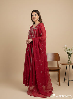 Maroon - Nayaab Chanderi Semi-Stitched Panel Design Chikankari Kurta & Dupatta Fabric With Soft Lining