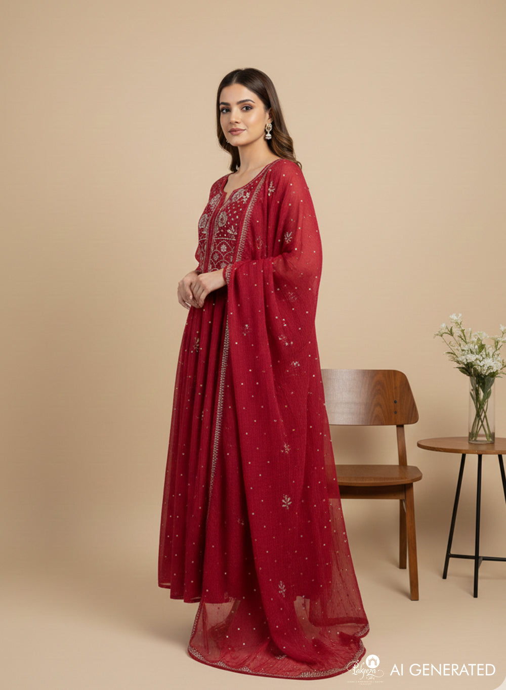 The semi-stitched format allows you to tailor the outfit to your perfect fit, while the matching Chanderi dupatta completes the look with effortless sophistication.