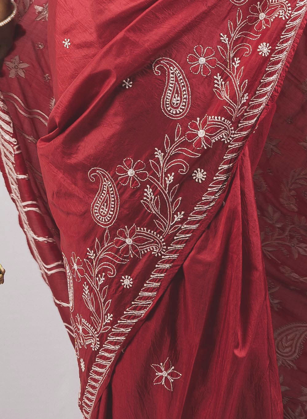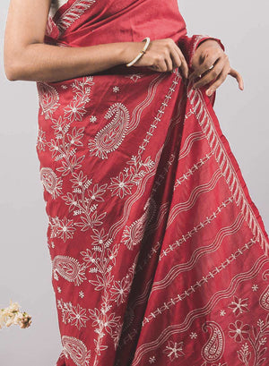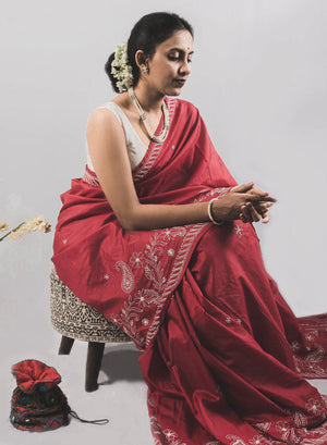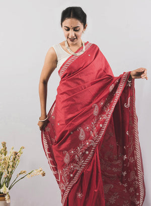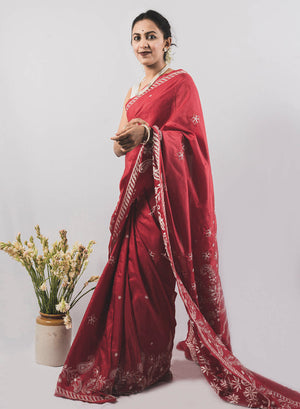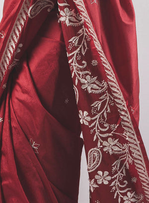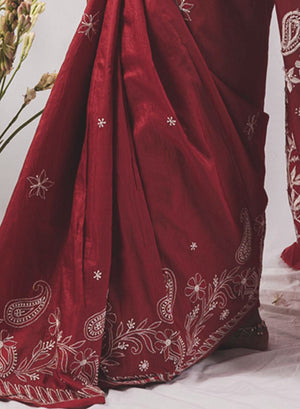 Maroon - Pure Silk Aks Resham Chikankari Saree