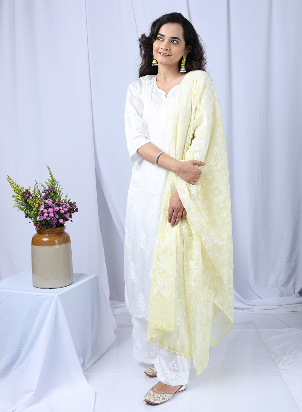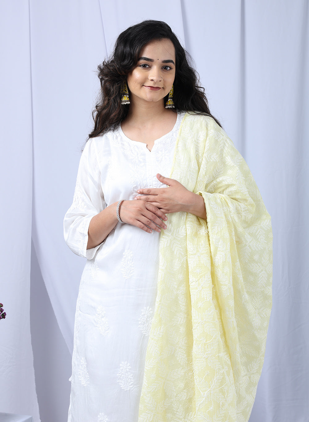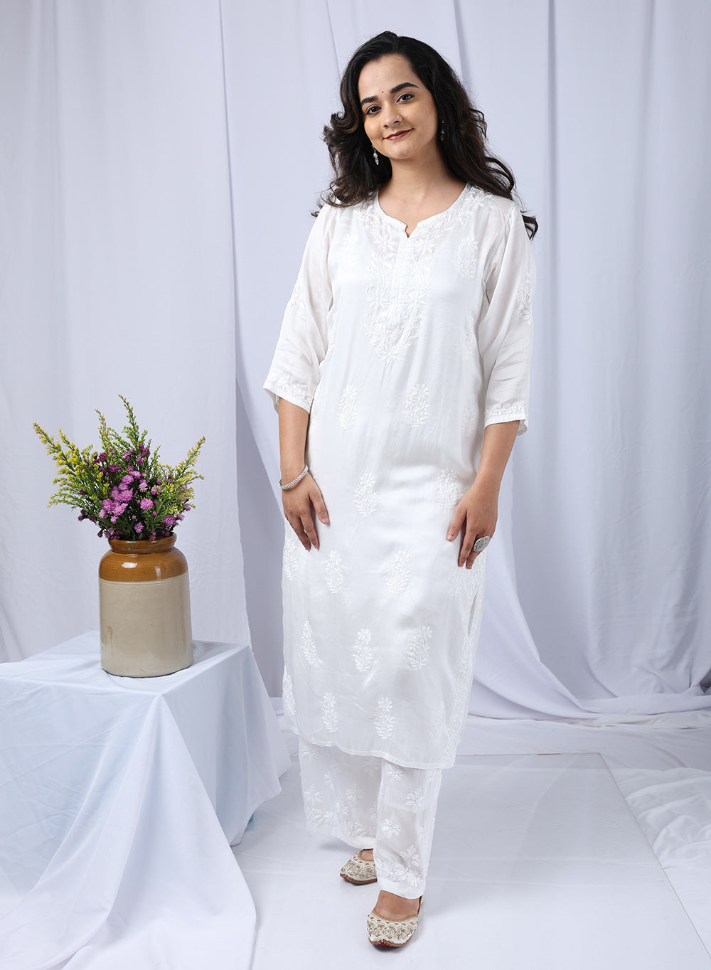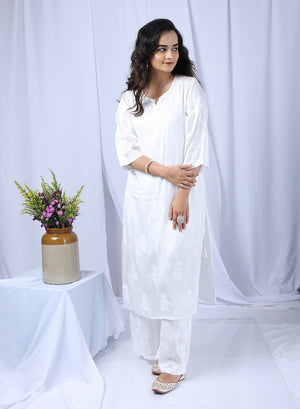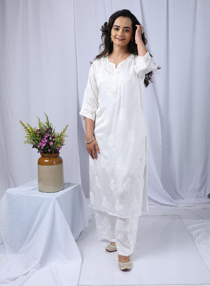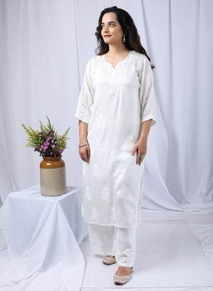 Crafted in rich, fluid satin fabric, Meera flows like poetry in motion, enhanced by a delicate ombre effect that adds depth and visual harmony. The kurta is meticulously adorned with hand-embroidered self-thread chikankari, bringing out the beauty of tradition with a modern, minimalist elegance.