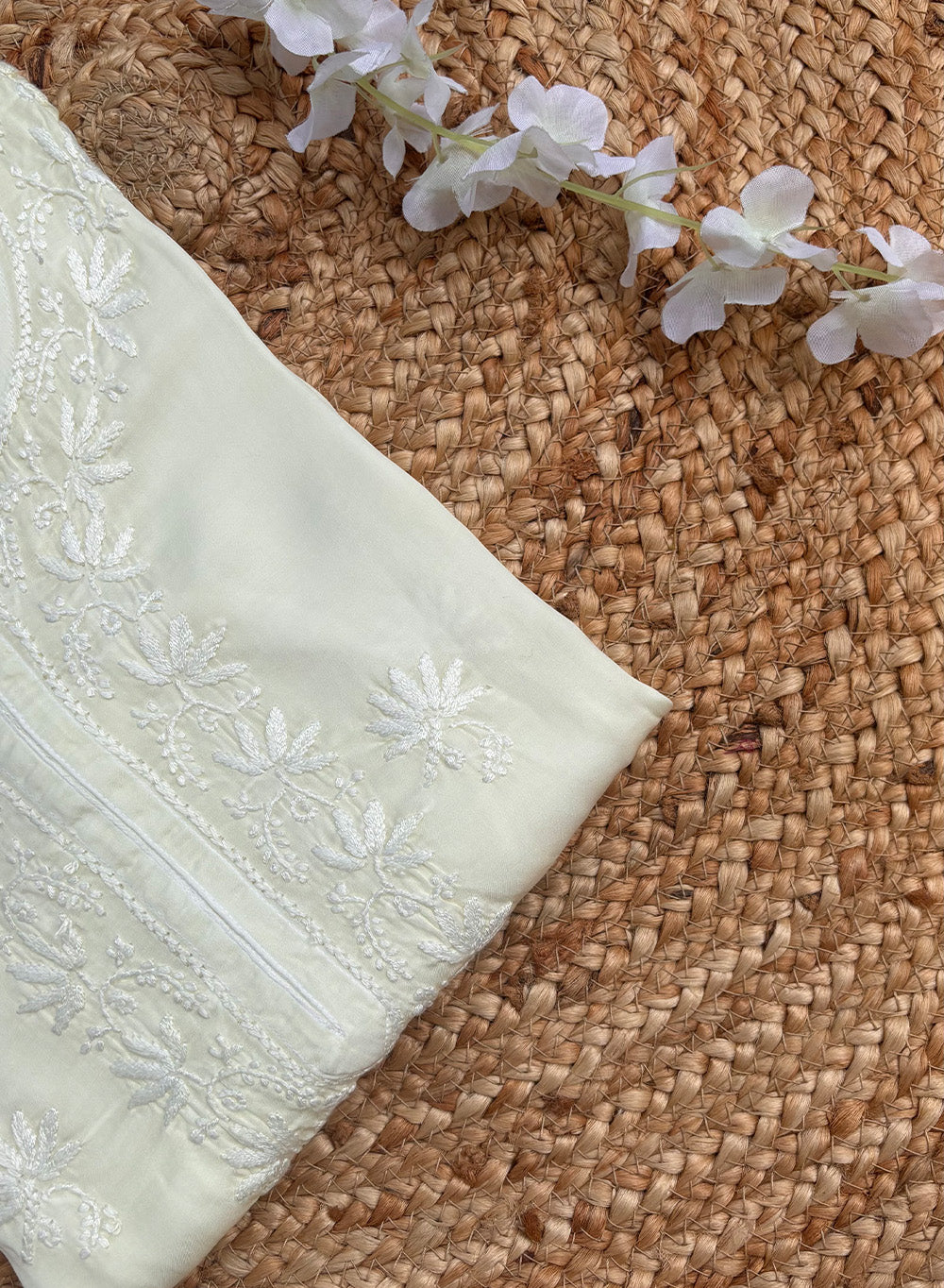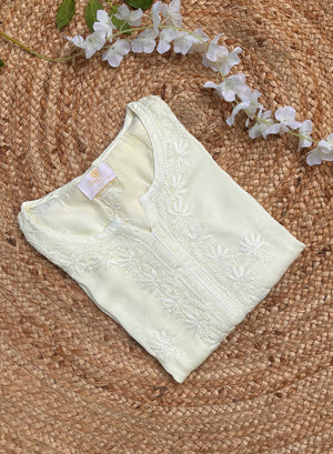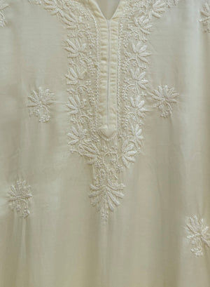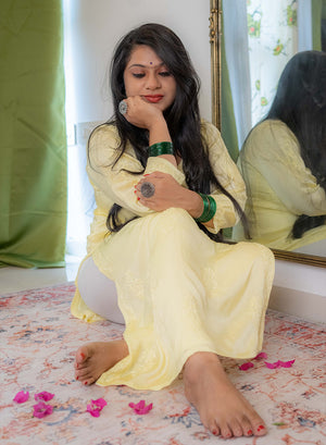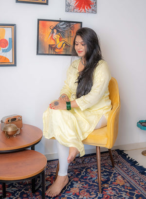Crafted in rich, fluid satin fabric, Meera flows like poetry in motion, enhanced by a delicate ombre effect that adds depth and visual harmony. The kurta is meticulously adorned with hand-embroidered self-thread chikankari, bringing out the beauty of tradition with a modern, minimalist elegance.