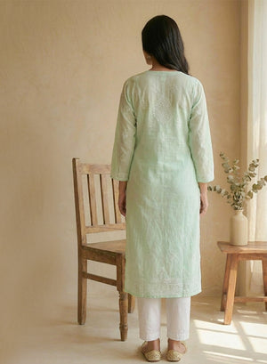 Mint Green With Crochet Lace - Cotton Terry Voile Bahaar Chikankari Kurta With Slip
