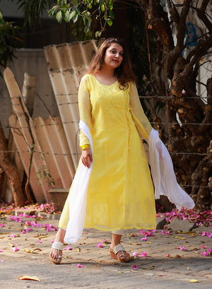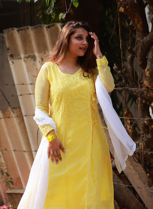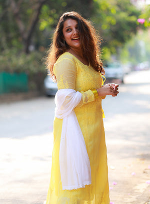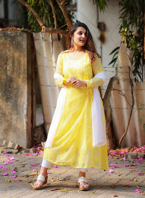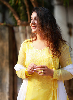 Sama Yellow - Hand-Embroidered Chikankari Kota Doria Angarakha