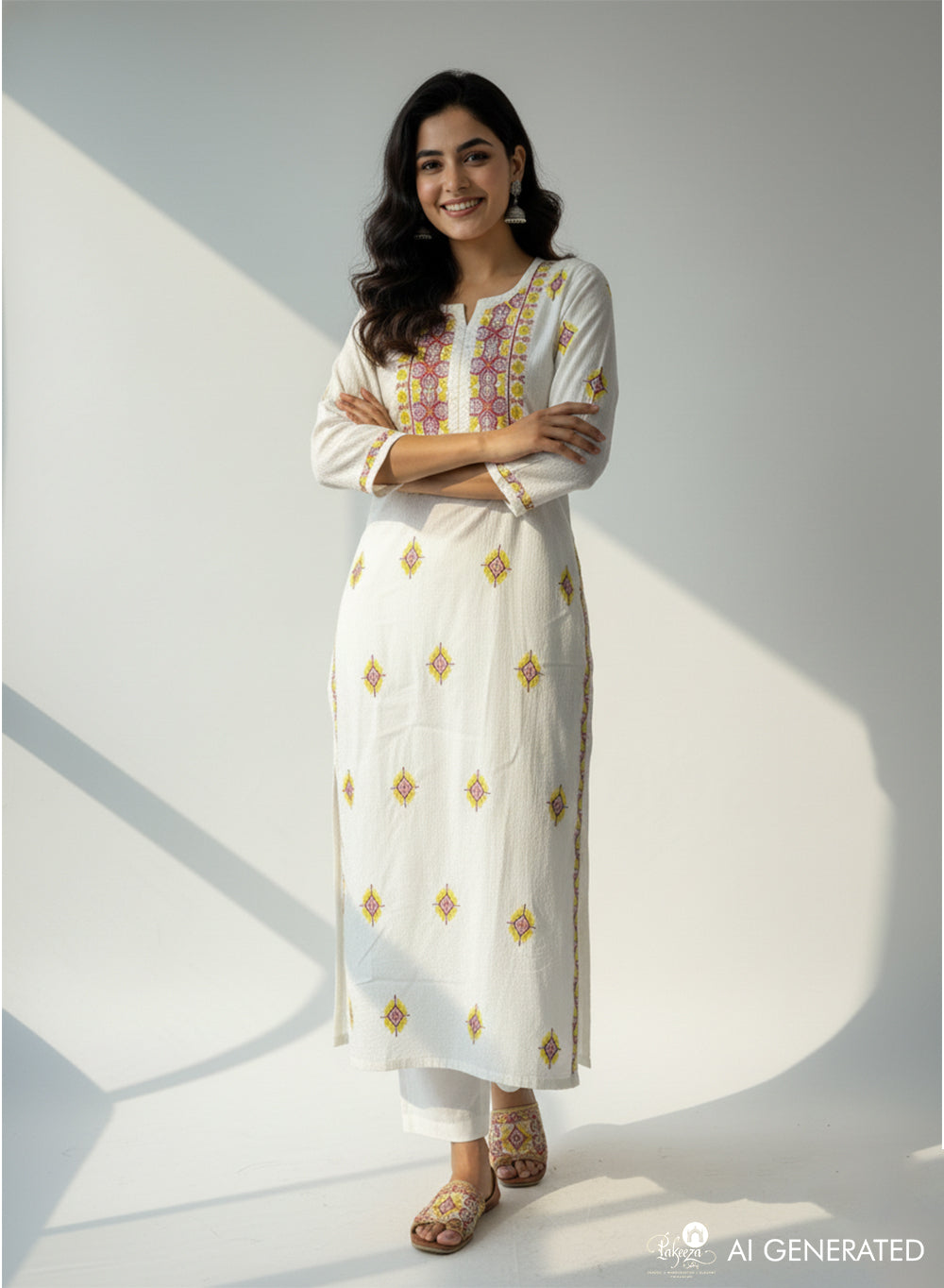 Our beautiful Multi-Color - Bahaar Cotton Slub Chikankari Kurta, has been hand embroidered with multi-color twisted cotton thread.