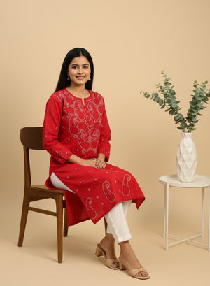 Our beautiful Red - Bahaar Cotton Terry Voile Chikankari Kurta, has been hand embroidered with twisted cotton thread.