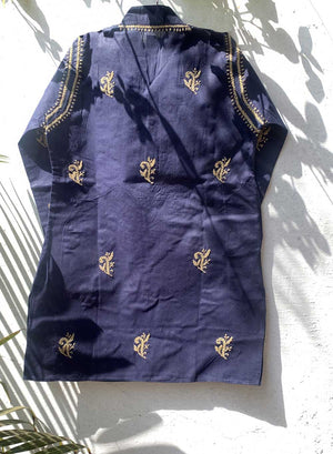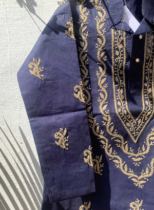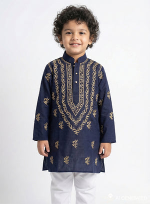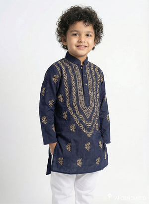 Our Navy Blue Cotton Kurta with hand embroidered chikankari in a traditional neck booti ,for Chhote Nawabs, are woven from finely milled cotton terry voile, cool and crisp against their soft skin.