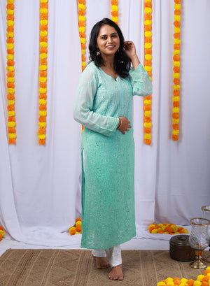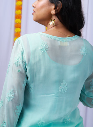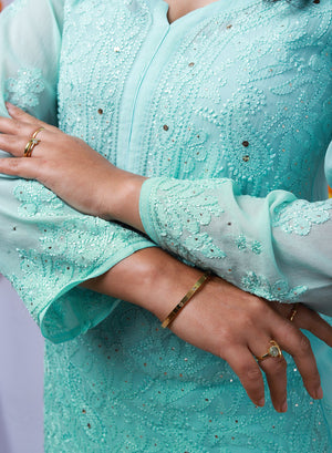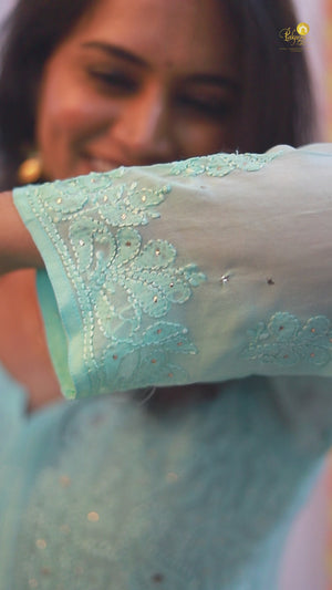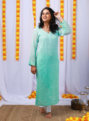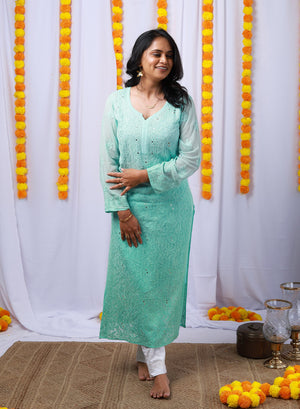 Nazakat Sea Green - Anjuman Viscose Ombre Front Jaal Chikankari Kurta