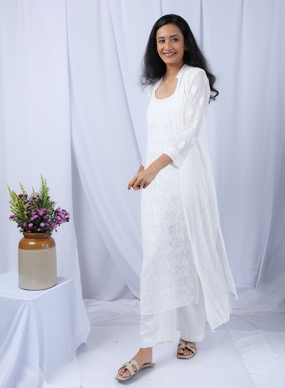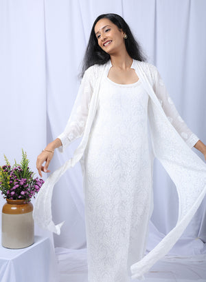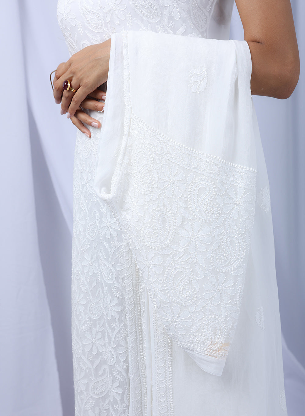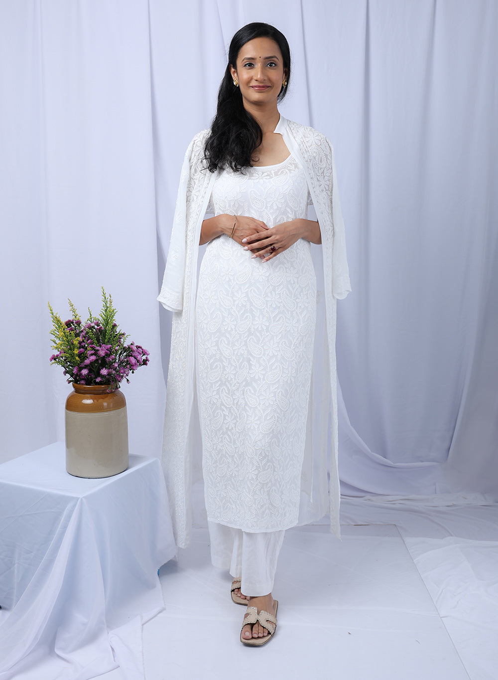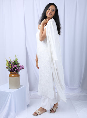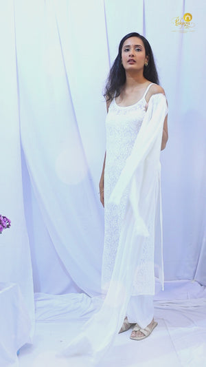 Made from rich white viscose, this set drapes beautifully and offers both comfort and refined style. The delicate, hand-embroidered chikankari motifs add a layer of intricate artistry, speaking volumes about the heritage of Lucknowi craftsmanship.