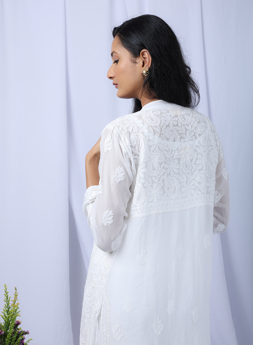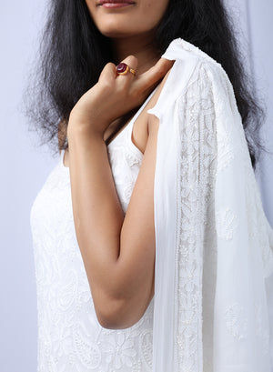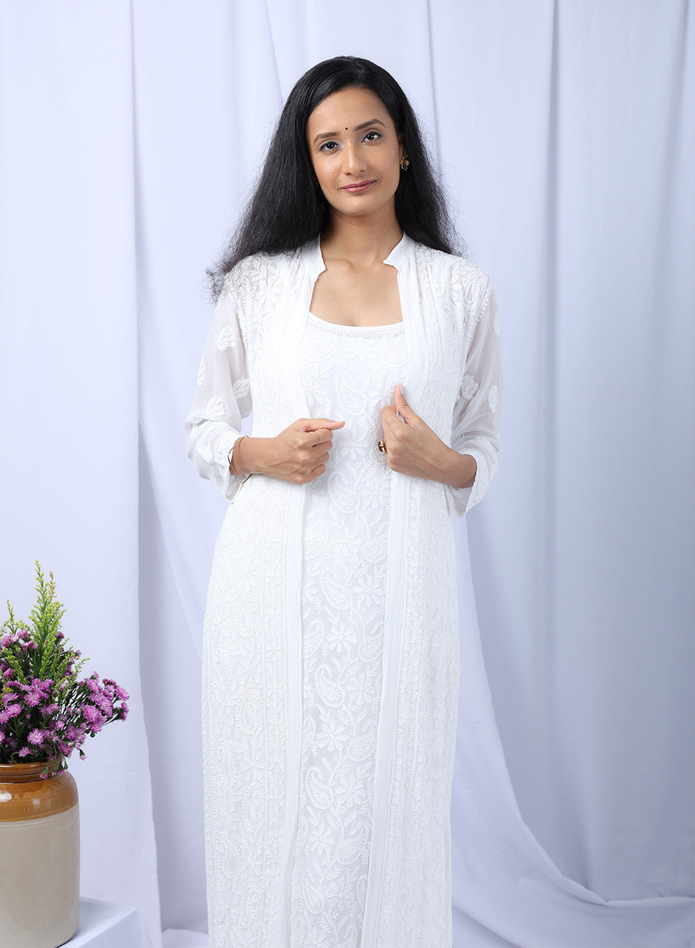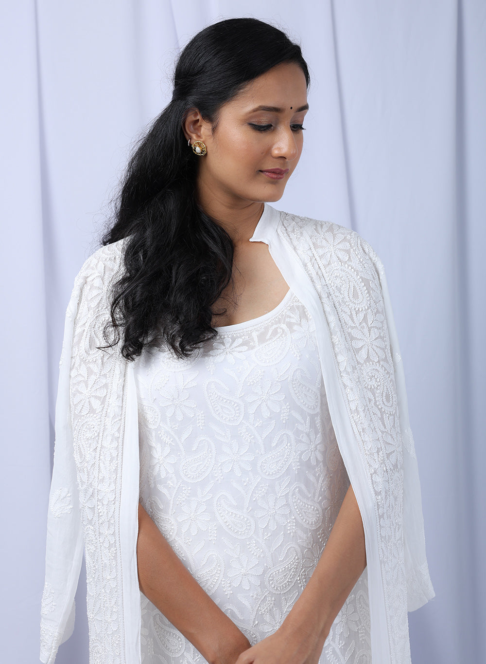 Made from rich white viscose, this set drapes beautifully and offers both comfort and refined style. The delicate, hand-embroidered chikankari motifs add a layer of intricate artistry, speaking volumes about the heritage of Lucknowi craftsmanship.