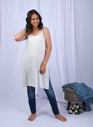 Our absolutely stunning and breezy, Noori White Viscose Noodle Strap Kurta is your go to kurta this season!