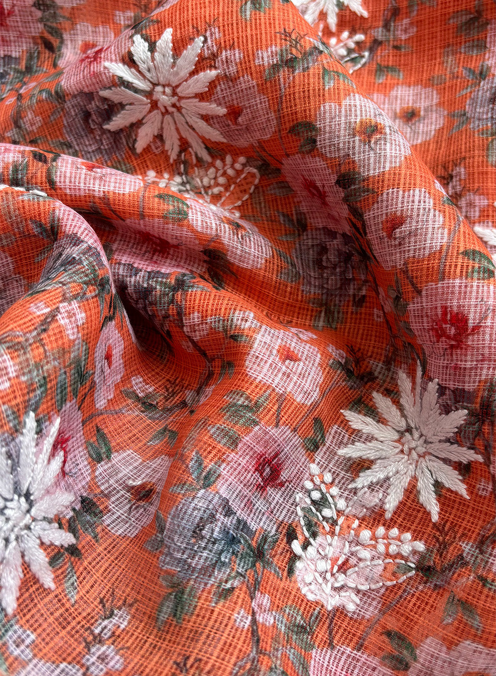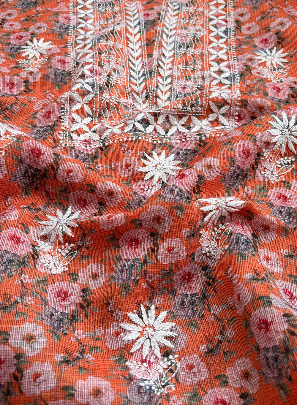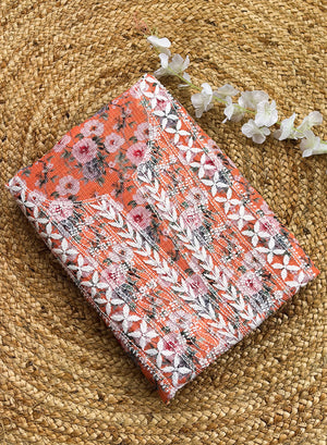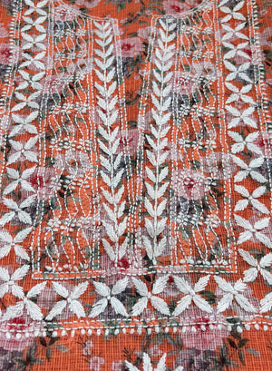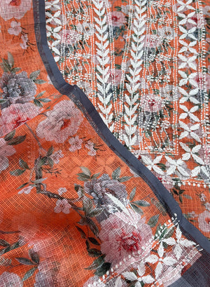 Our Orange Printed Kota Cotton Kurta Fabric & Dupatta Set, has been hand embroidered with twisted cotton thread .