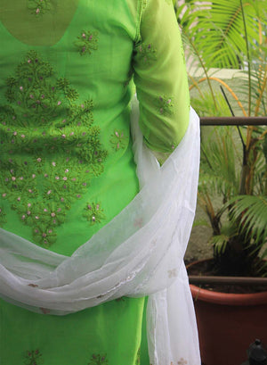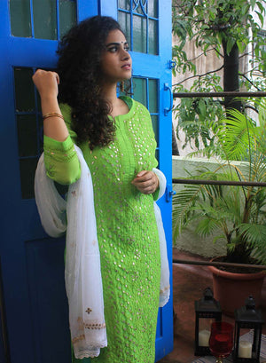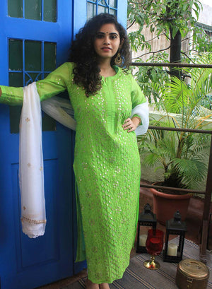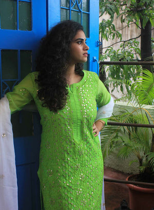 Parrot Green Gota Patti - Firdaus Chanderi Chikankari Kurta
