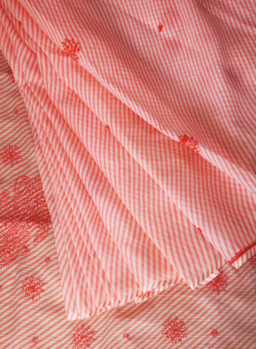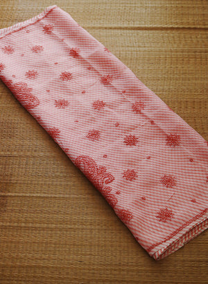 Our best selling Lehariya Kota Aks Cotton Chikankari Saree, has beautiful big paisley motifs in the pallu and flowers hand embroidered all over the saree. The chikankari has been done with twisted cotton thread.