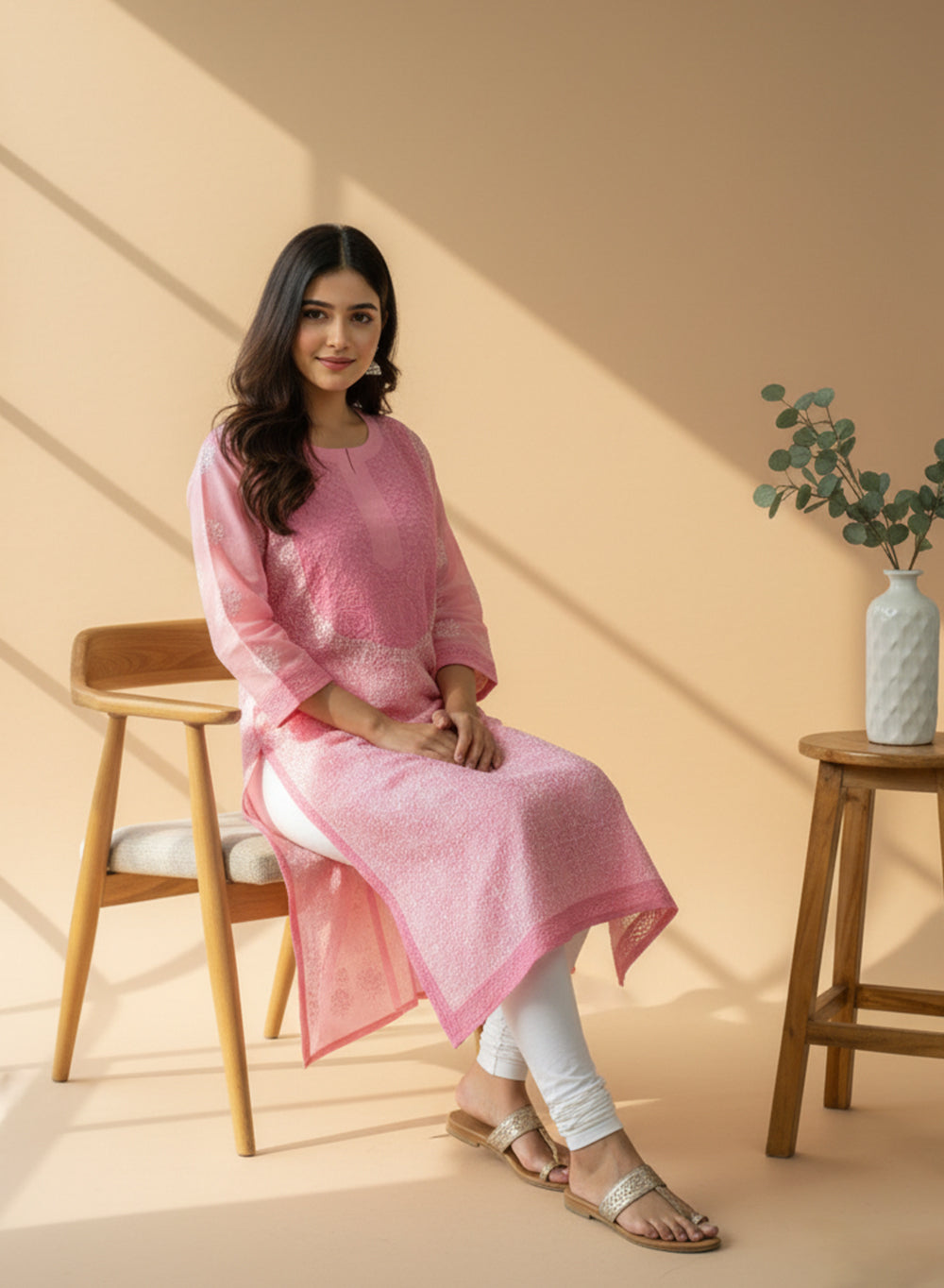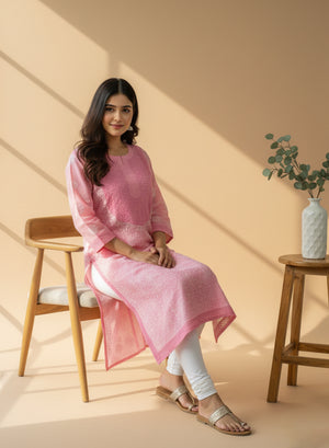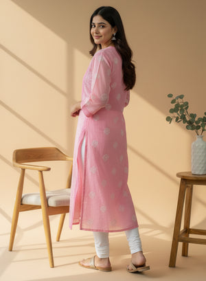 Our beautiful Light Pink - Bahaar Cotton Terry Voile Chikankari Kurta, has been hand embroidered with twisted cotton thread.