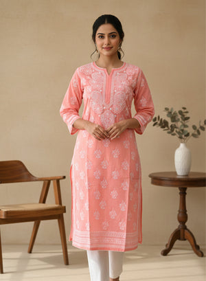 Peach Pink With Crochet Lace - Cotton Terry Voile Bahaar Chikankari Kurta With Slip