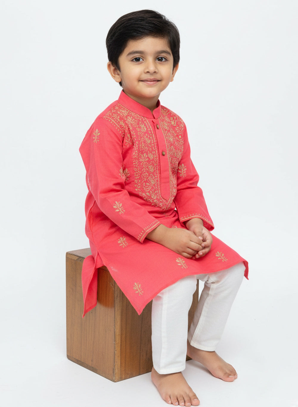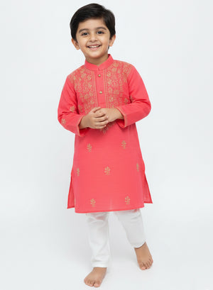 Our Peach Pink & Yellow Cotton Chikankari Kurta with hand embroidered chikankari in a traditional neck booti ,for Chhote Nawabs, are woven from finely milled cotton terry voile, cool and crisp against their soft skin.