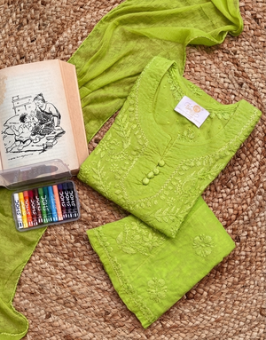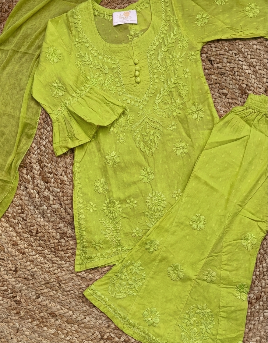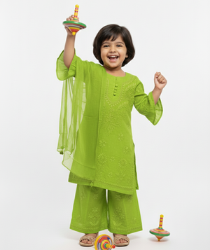Pihu Light Green - Dobby Cotton Chikankari Kidswear Set