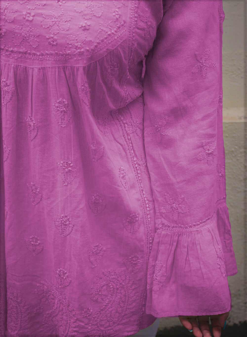 Our one of a kind Pure Cotton Short Top, has been hand embroidered with beautiful chikankari motifs with bell sleeves for that etc. oomph!