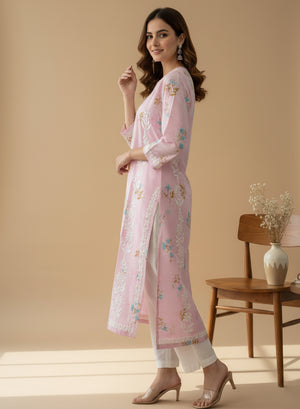 Pink Floral - Bahaar Mul Cotton Chikankari Kurta, made from the finest Mul Cotton Fabric, known for its feather-light texture and breathability, these kurta sets are a dream against the skin, perfect for both day and evening wear.