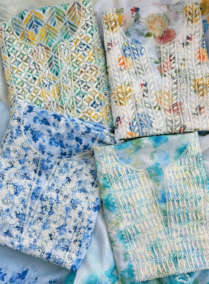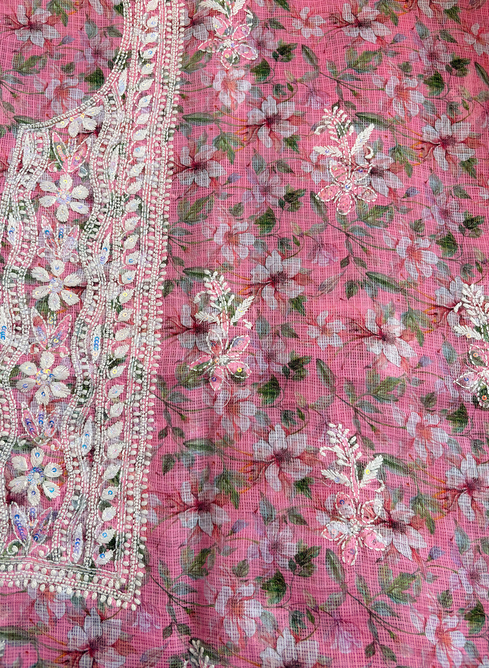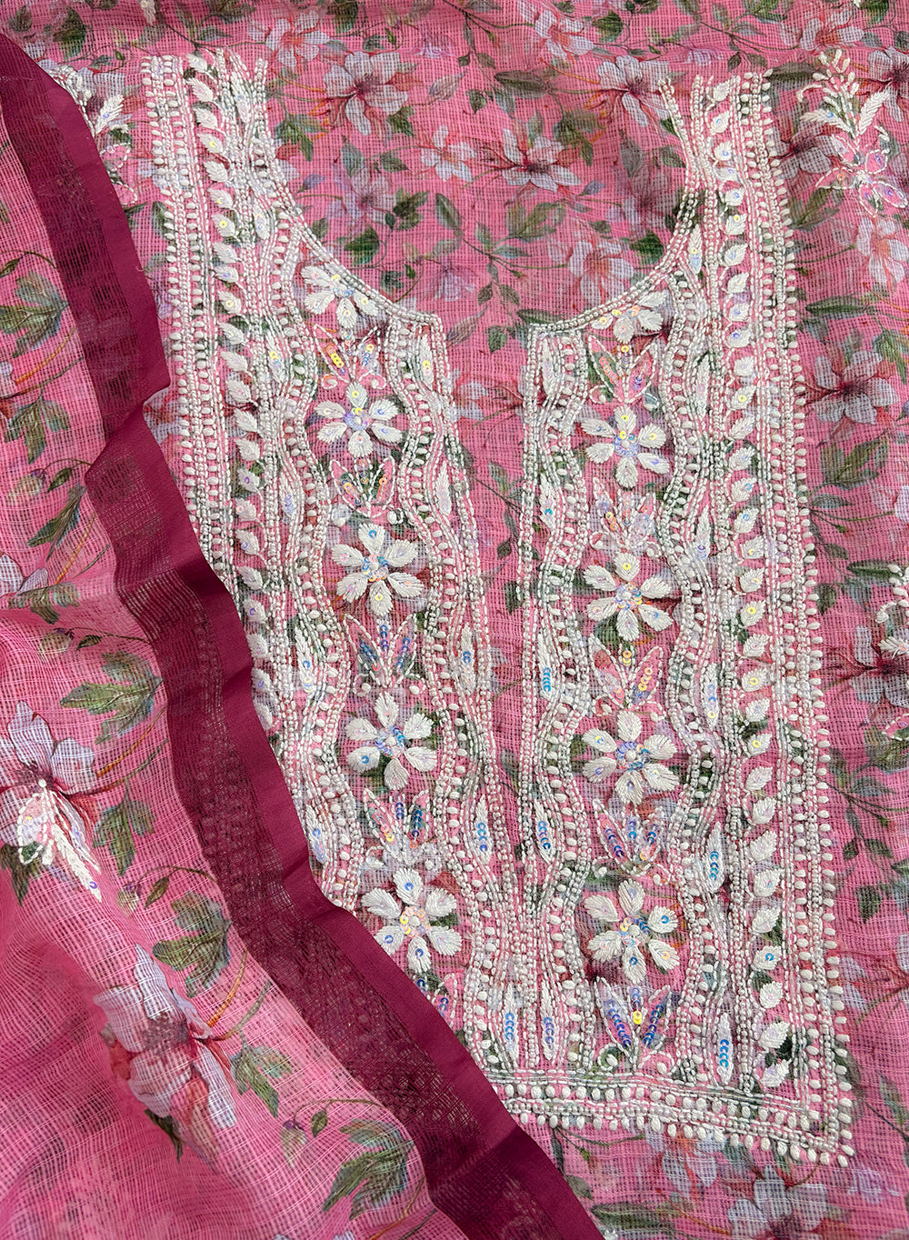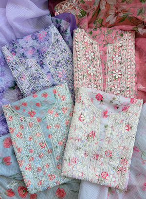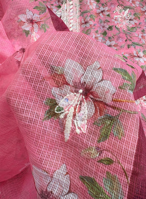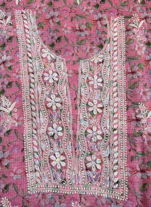 Our Pink - Nayaab Katdana Kota Printed Chikankari Full Dress Set has been hand embroidered with twisted cotton thread and embellished with beautiful sequins, pearls, katdana and mirror work.