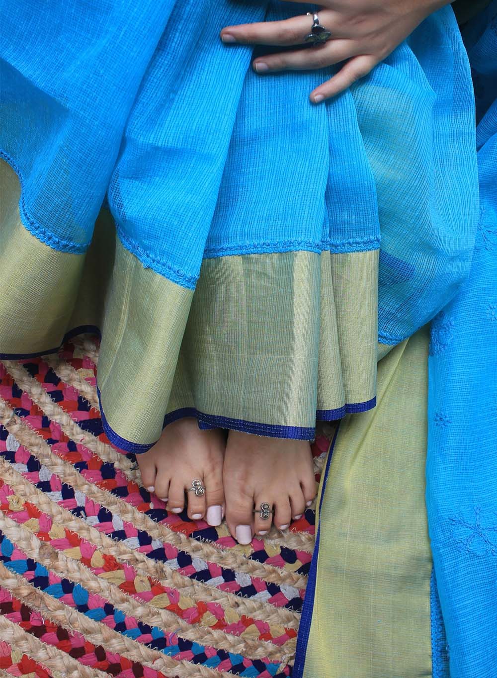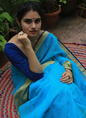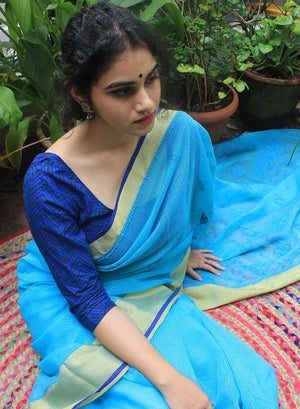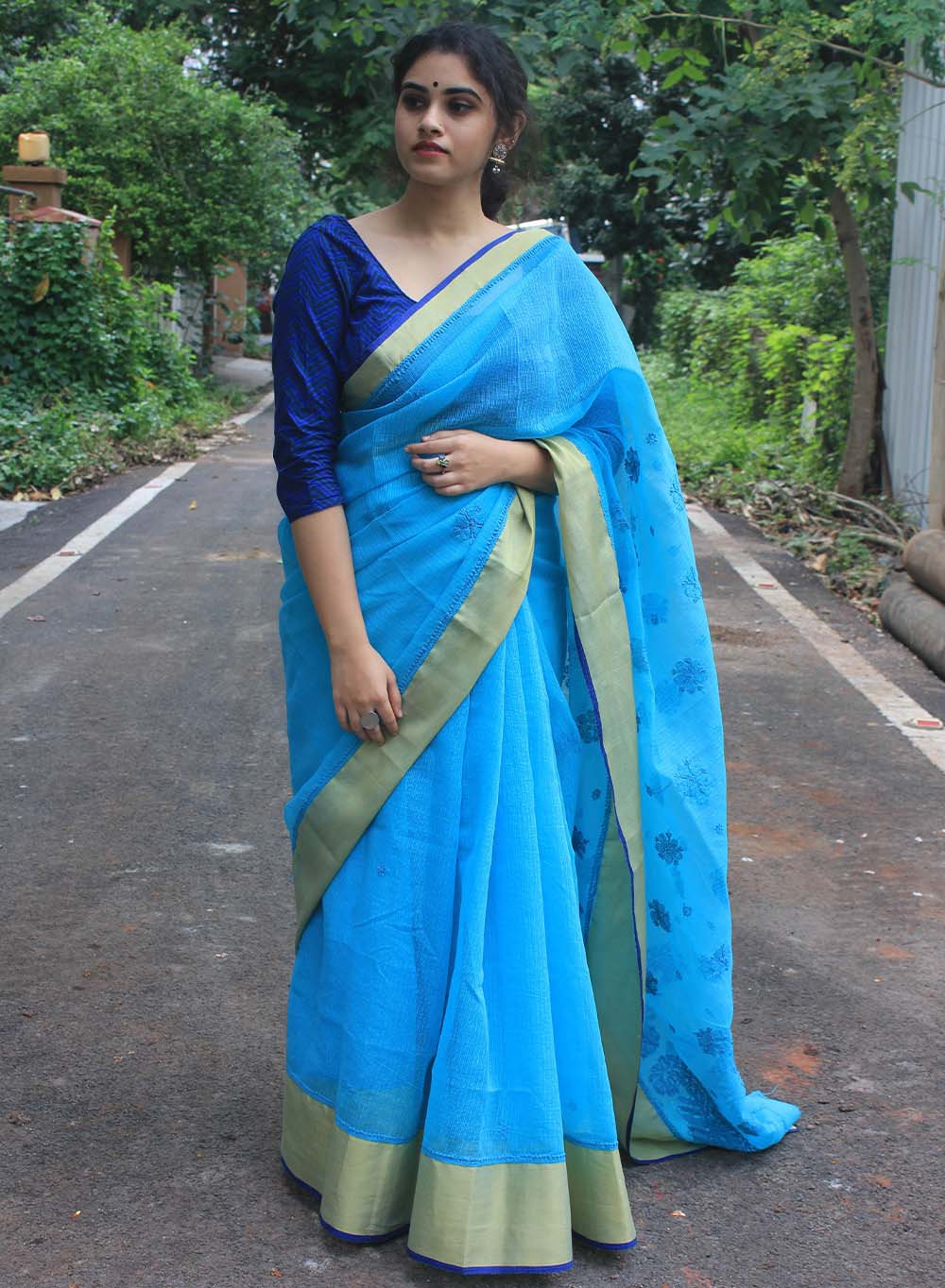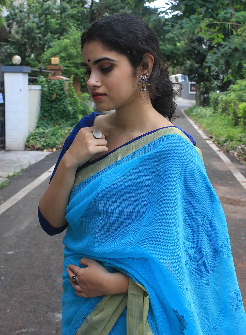 Our all time favorite, Zari Kota Chanderi Cotton Saree, has stunning motifs, hand embroidered with twisted blue cotton thread.