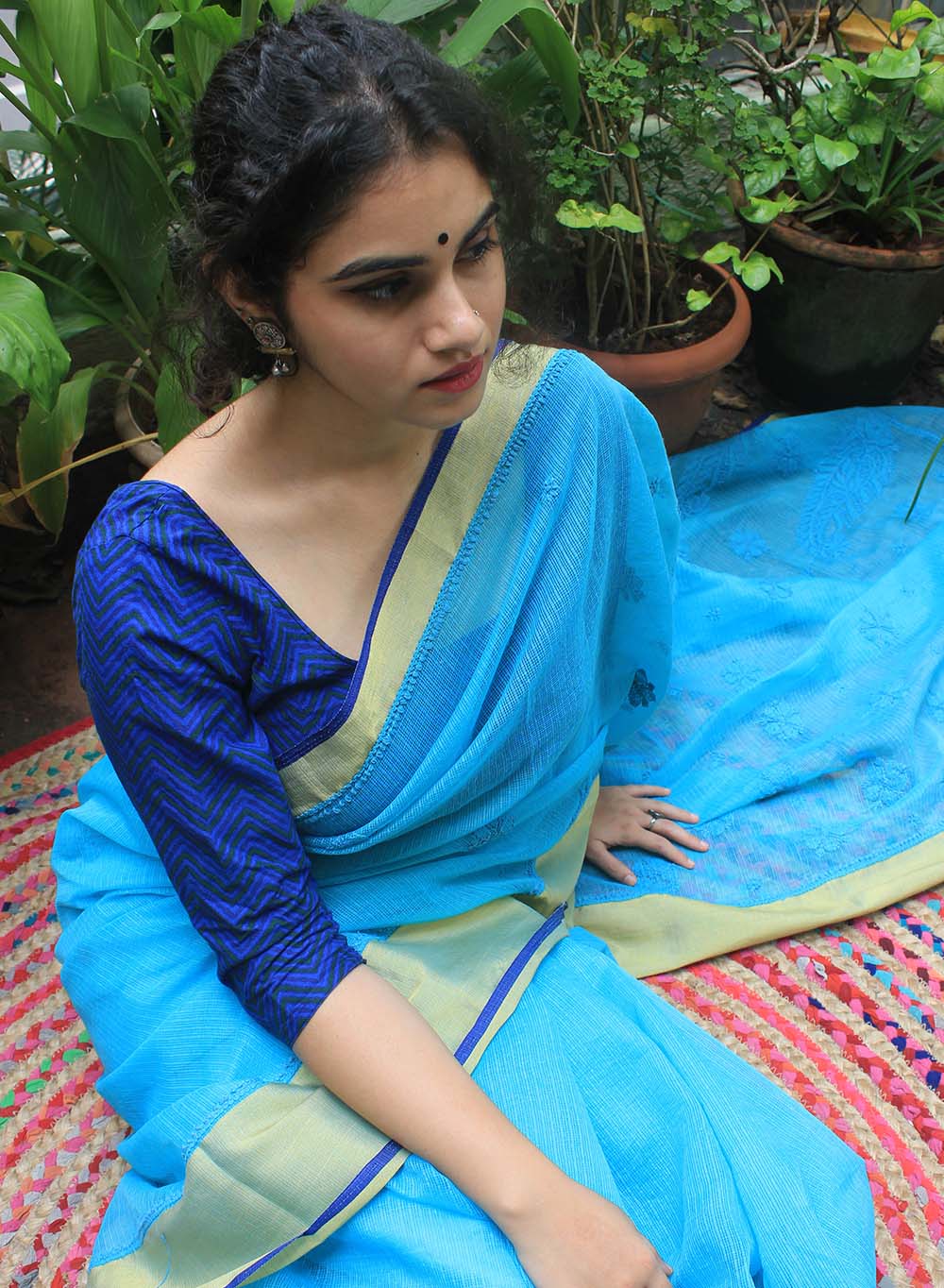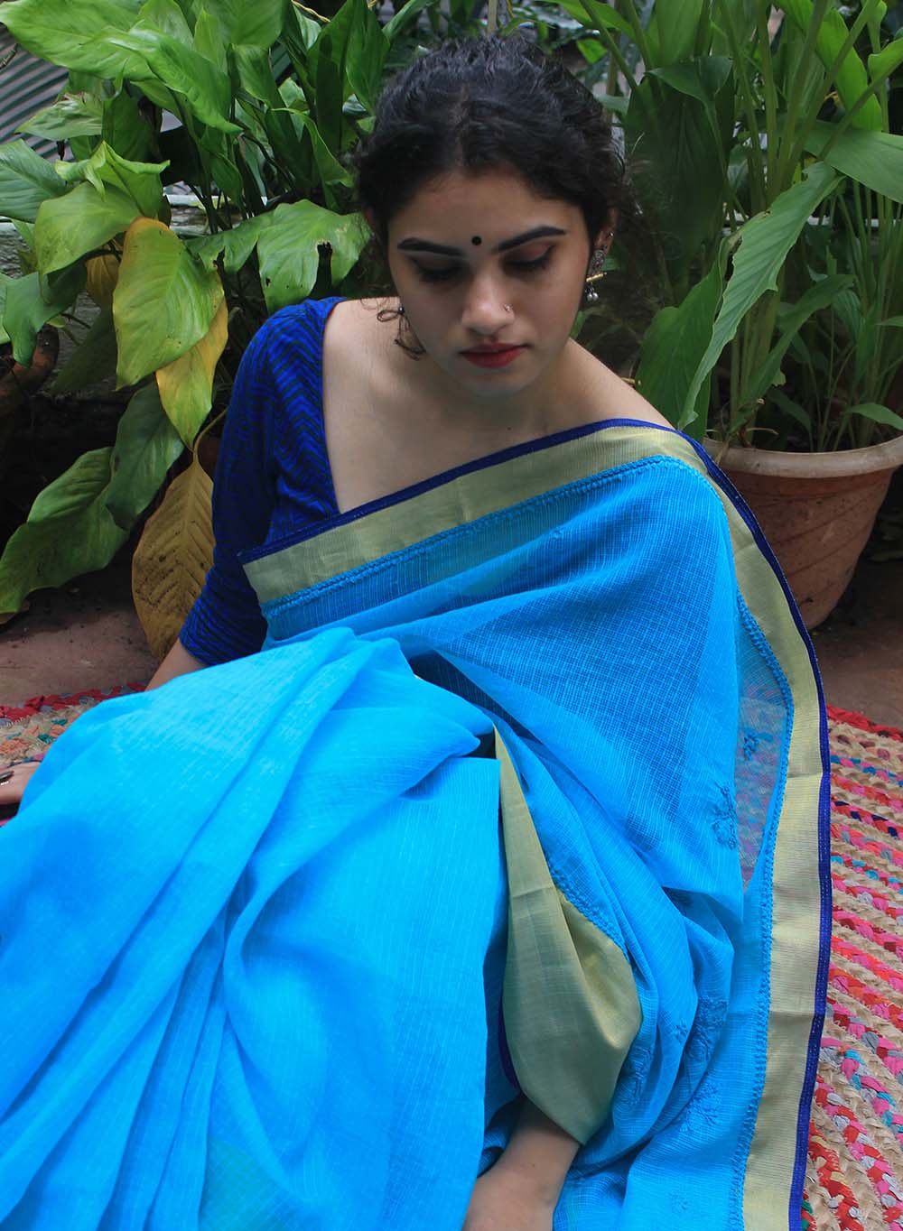Blue Zari Kota Chanderi - Aks Cotton Chikankari Saree