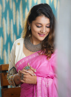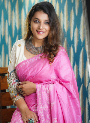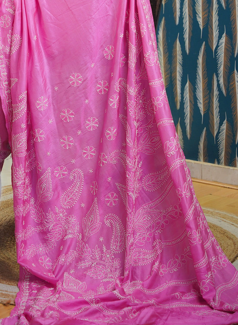 Pink - Pure Silk Aks Resham Chikankari Saree