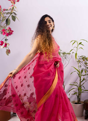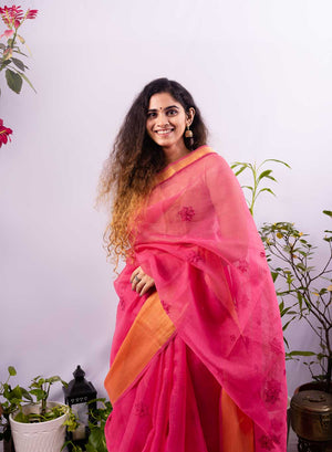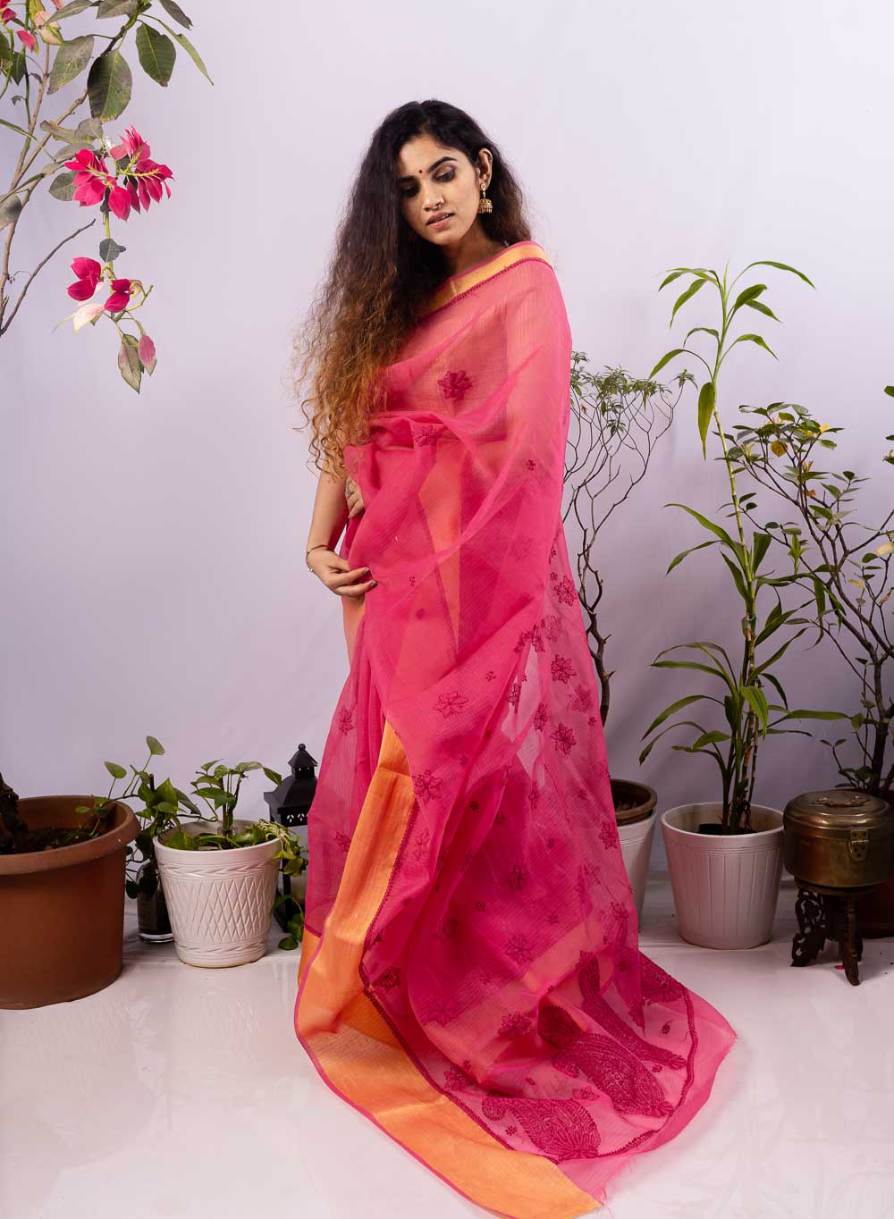 Pink Zari Kota Chanderi - Aks Cotton Chikankari Saree
