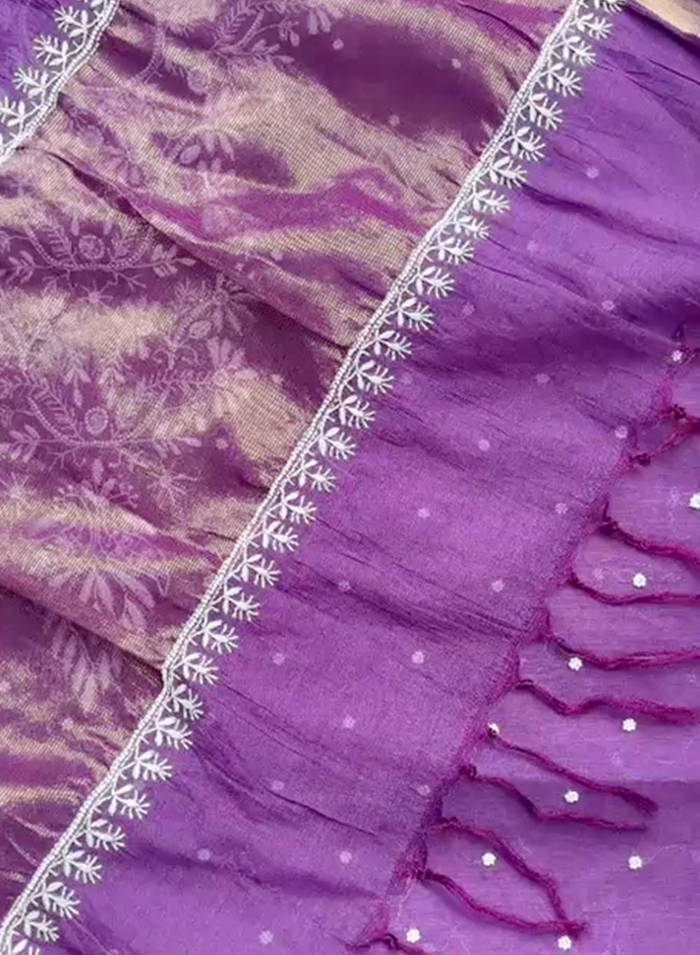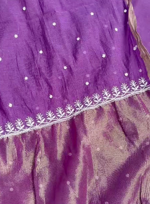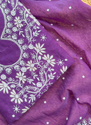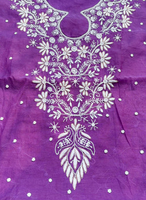 Our Purple - Nayaab Mul Chanderi Chikankari Dress Material With Moti & Katdana Work, has been hand embroidered with twisted white cotton thread,