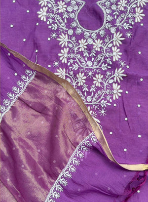 Purple - Nayaab Mul Chanderi Chikankari Dress Material With Moti & Katdana Work