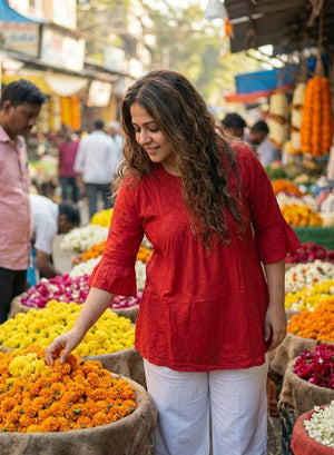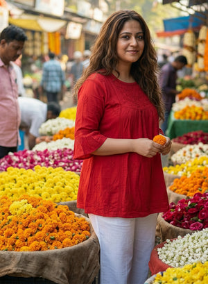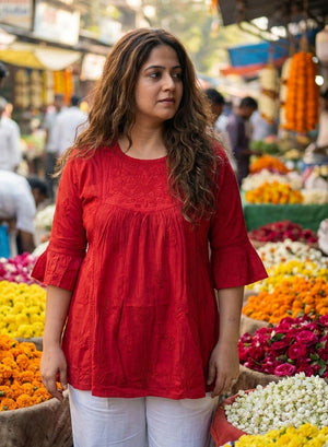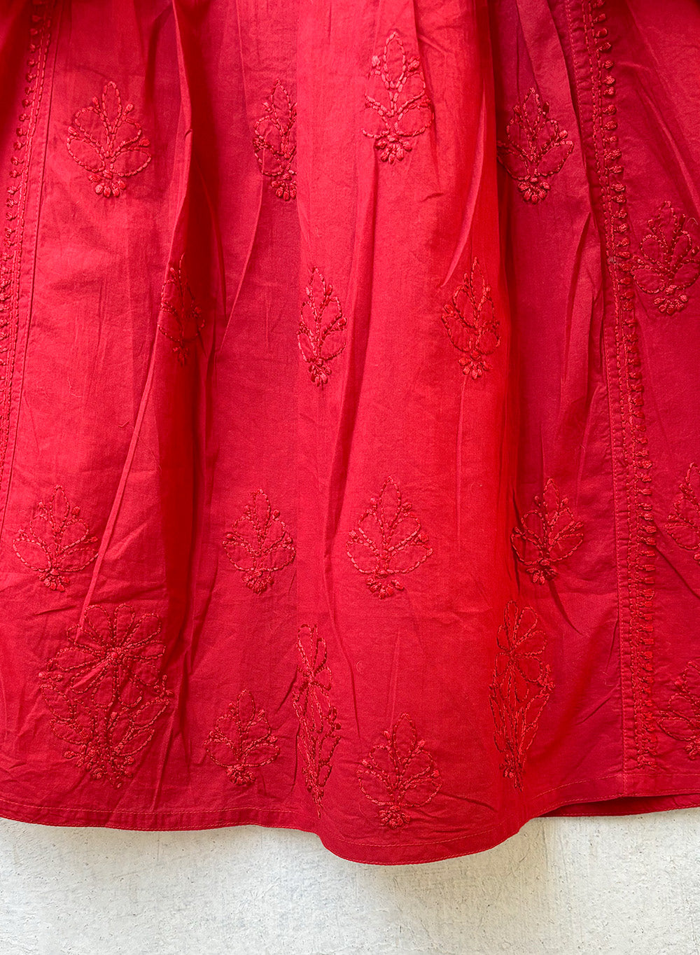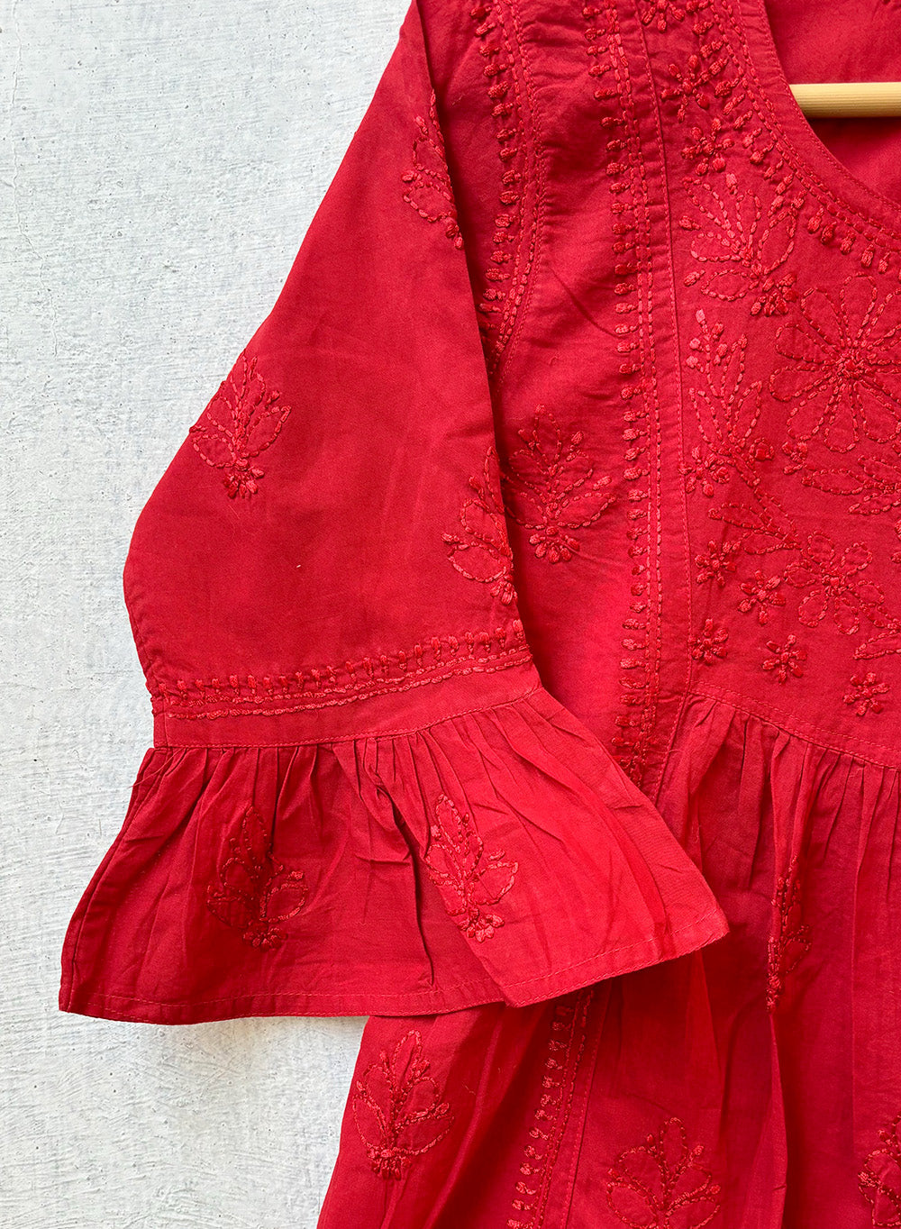 Red Bell Sleeves - Pure Cotton Gulshan Chikankari Short Top
