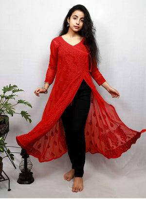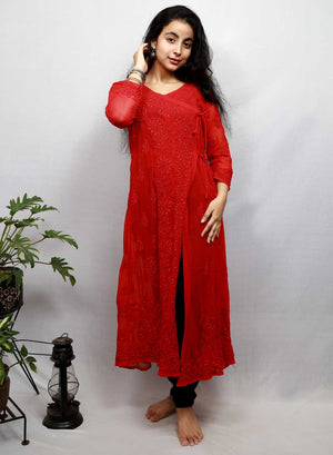 Red Mukaish - Anjuman Georgette Chikankari Angarakha