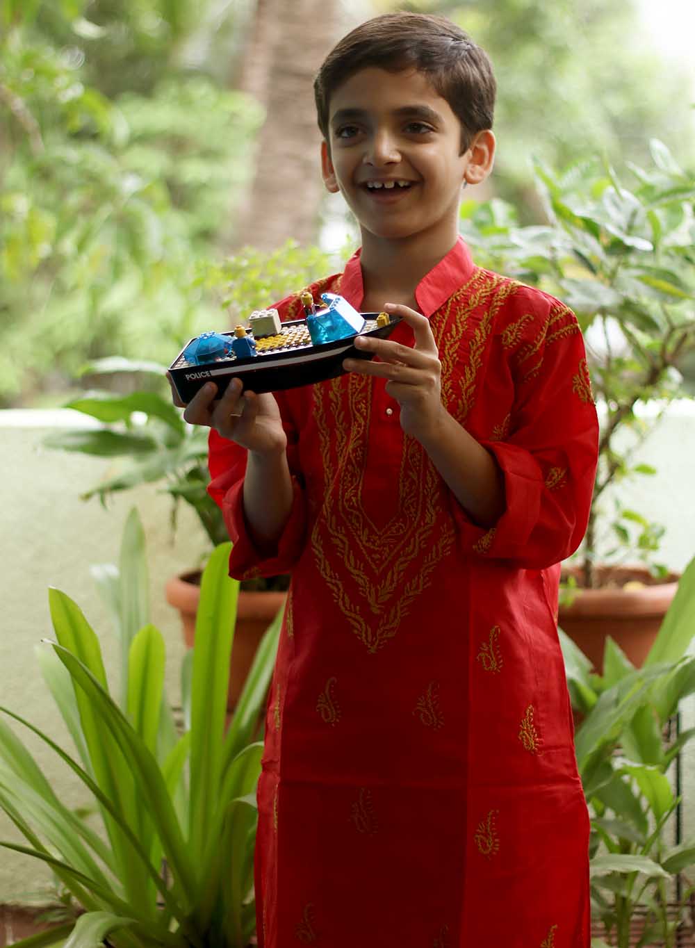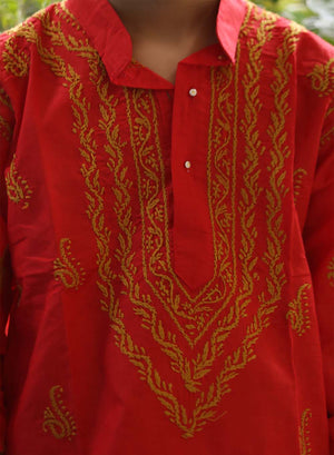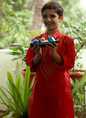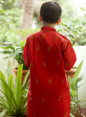 Our Navy Blue Cotton Kurta with hand embroidered chikankari in a traditional neck booti ,for Chhote Nawabs, are woven from finely milled cotton terry voile, cool and crisp against their soft skin.