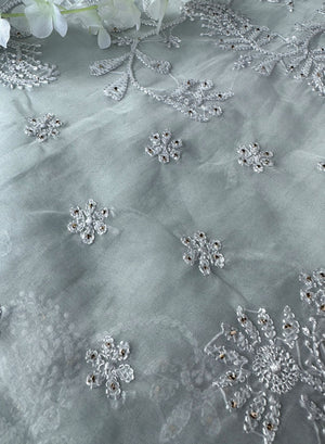 Our absolutely stunning, Ruhani Organza Saree, has been hand embroidered with self resham thread.