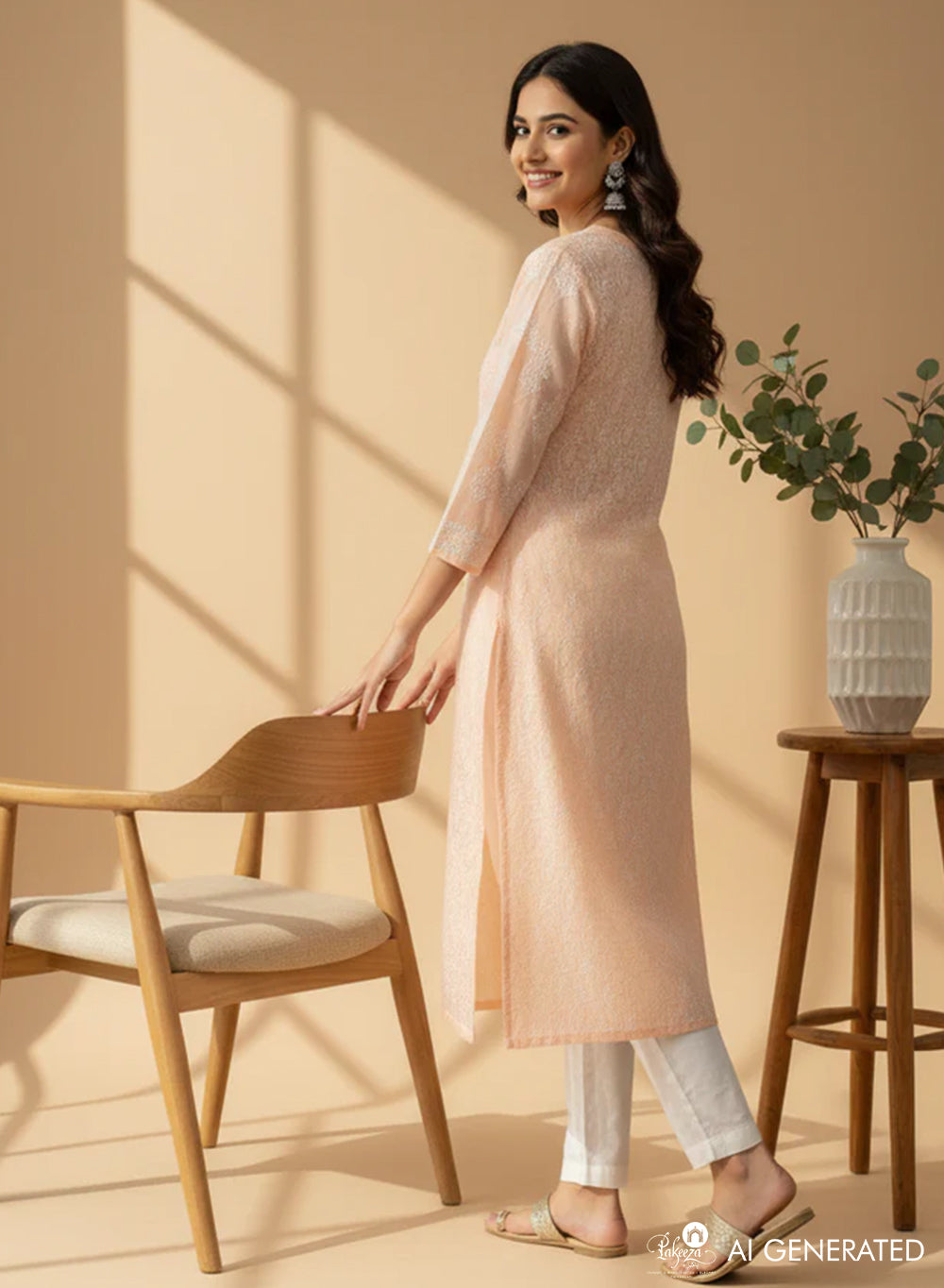 Our beautiful Salmon Pink - Bahaar Cotton Terry Voile Chikankari Kurta, has been hand embroidered with twisted cotton thread.