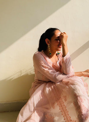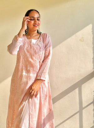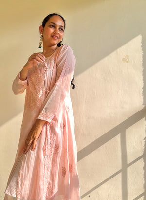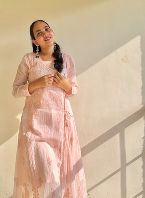 Sama Dusky Pink - Hand-Embroidered Chikankari Kota Doria Angarakha