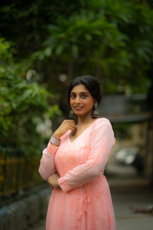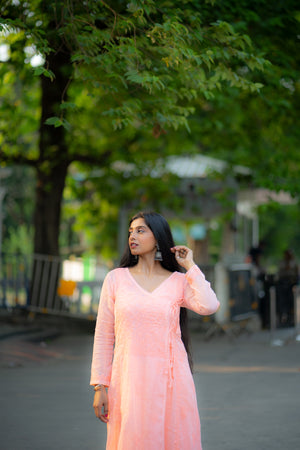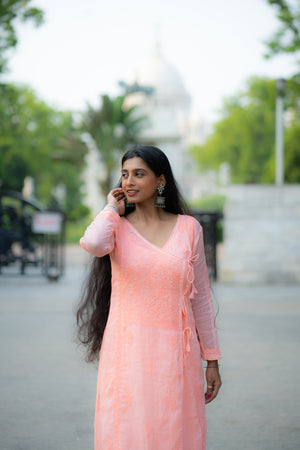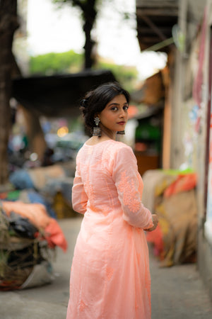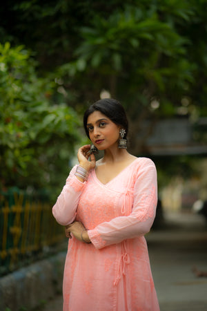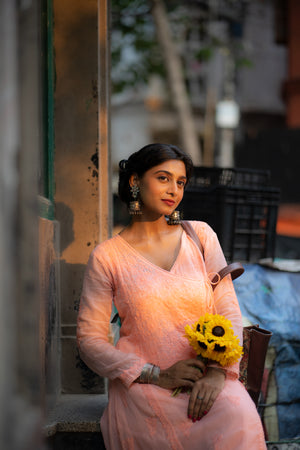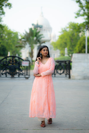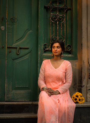 Sama Peach - Hand-Embroidered Chikankari Kota Doria Angarakha