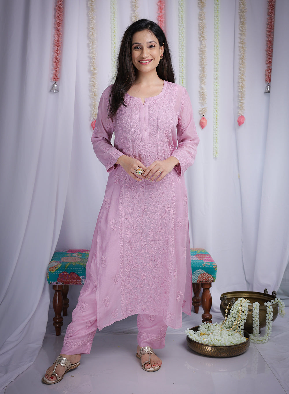 Staying true to its name, this Muslin Kurta & Palazzo Set, blooms with a delicate front panel lotus design embroidery intricately hand-embroidered all over, capturing the serenity and elegance of the flower. The Palazzo has a narrow bottom and comes with a soft cotton lining and pockets.