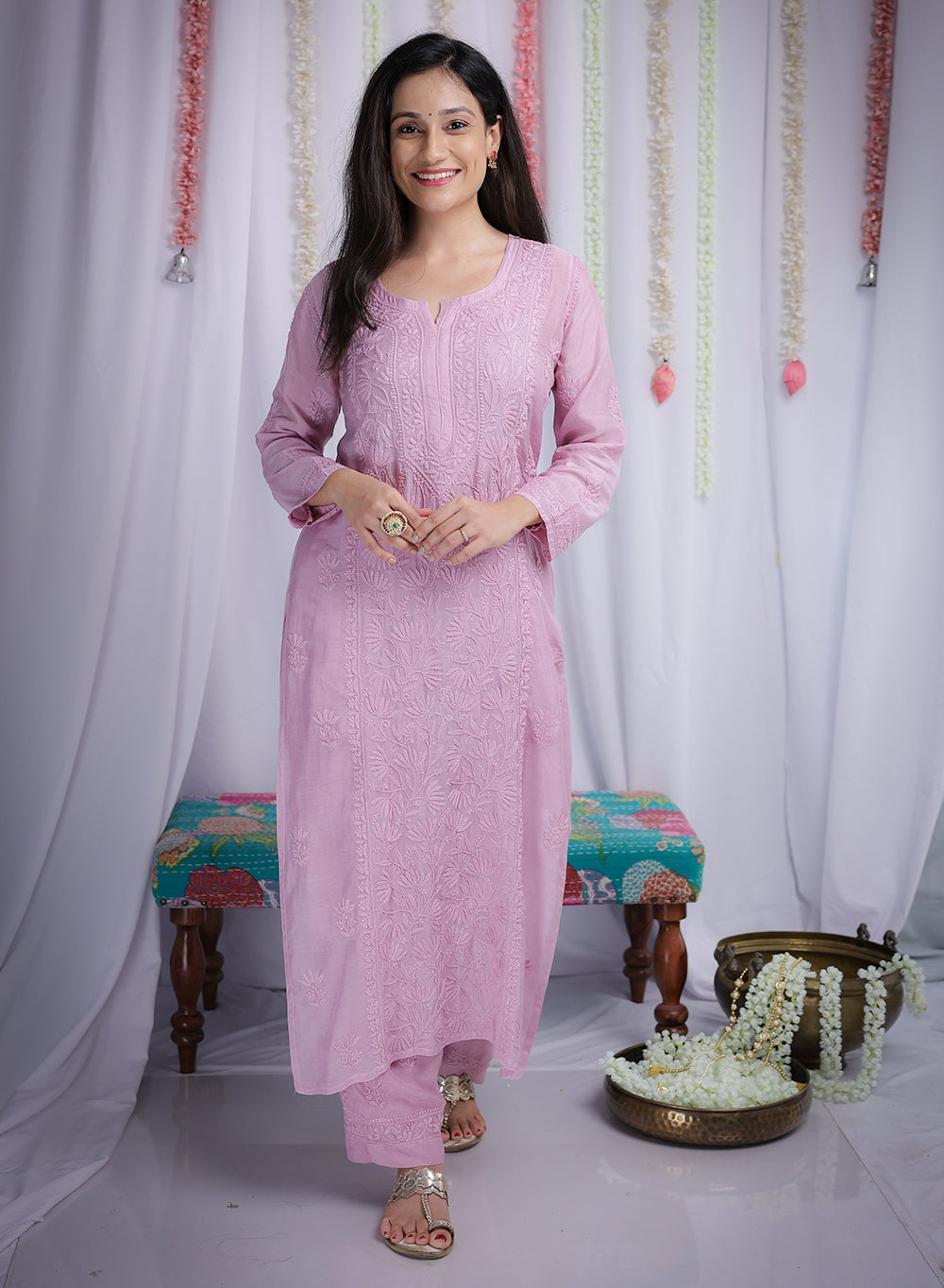 Crafted in airy muslin, Saroj offers effortless comfort while reflecting timeless artistry. Its intricate detailing and lightweight fabric make it a versatile piece, perfect for serene daytime wear or graceful festive gatherings.
