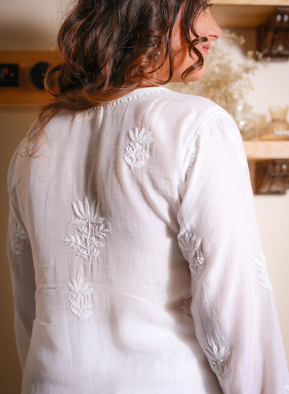 Staying true to its name, this Muslin Kurta & Palazzo Set, blooms with a delicate front panel lotus design embroidery intricately hand-embroidered all over, capturing the serenity and elegance of the flower. The Palazzo has a narrow bottom and comes with a soft cotton lining and pockets.
