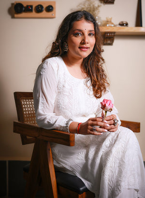 Crafted in airy muslin, Saroj offers effortless comfort while reflecting timeless artistry. Its intricate detailing and lightweight fabric make it a versatile piece, perfect for serene daytime wear or graceful festive gatherings.