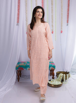 Staying true to its name, this Muslin Kurta & Palazzo Set, blooms with a delicate front panel lotus design embroidery intricately hand-embroidered all over, capturing the serenity and elegance of the flower. The Palazzo has a narrow bottom and comes with a soft cotton lining and pockets.